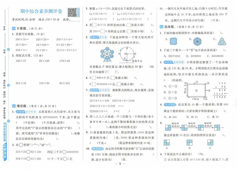 苏教版四年级数学上学期期末测试卷九video