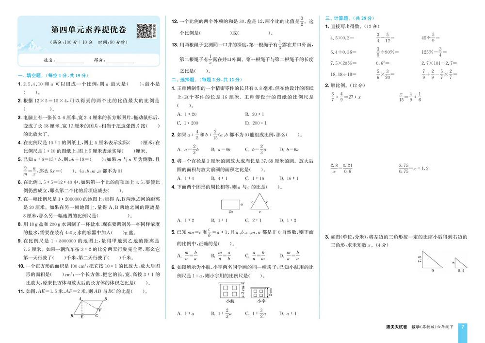 苏教版六年级下册数学第四单元检测卷七