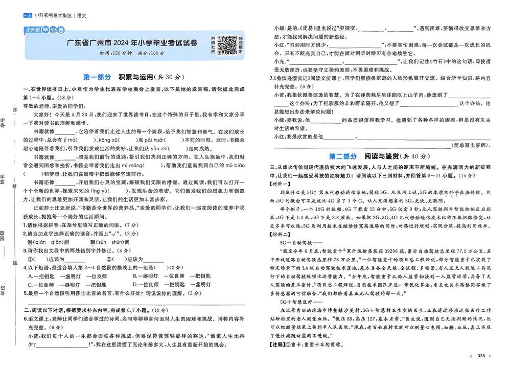 广东省广州市 2024 年小学毕业考试语文试卷video