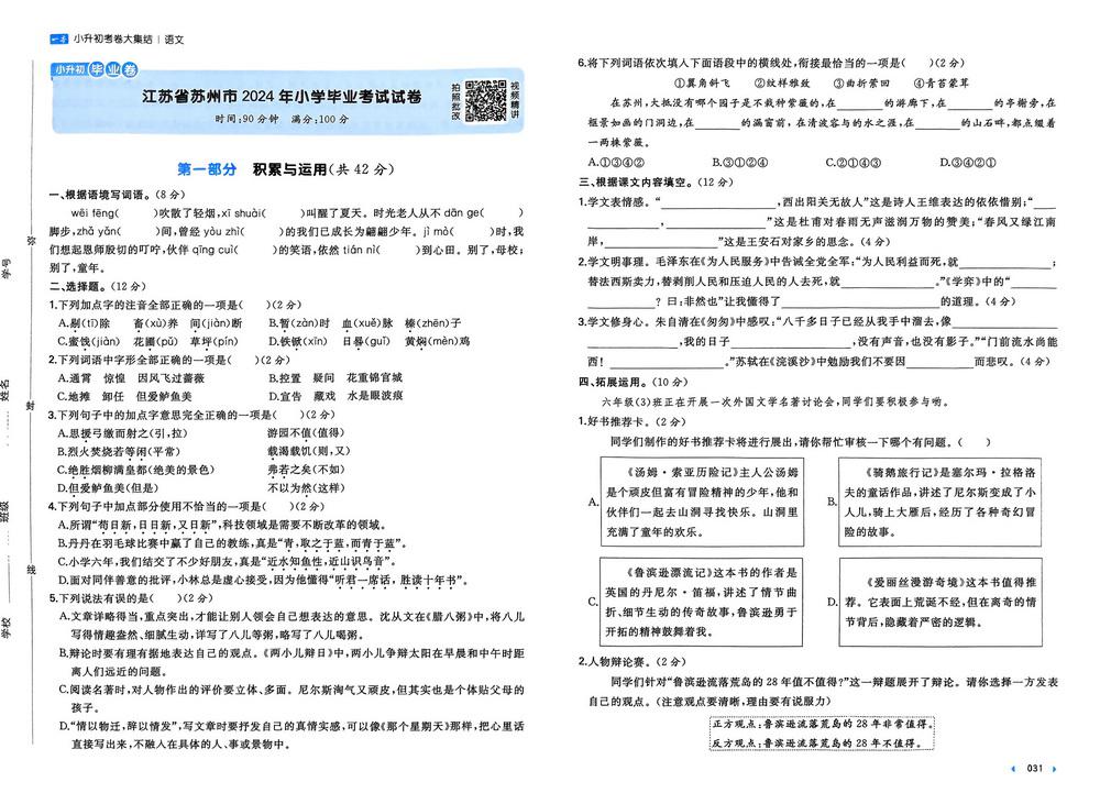 江苏省苏州市 2024 年小学毕业考试语文试卷video
