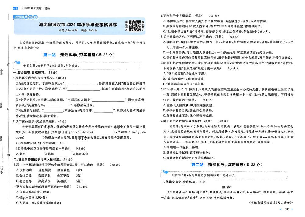 湖北省武汉市 2024 年小学毕业考试语文试卷video