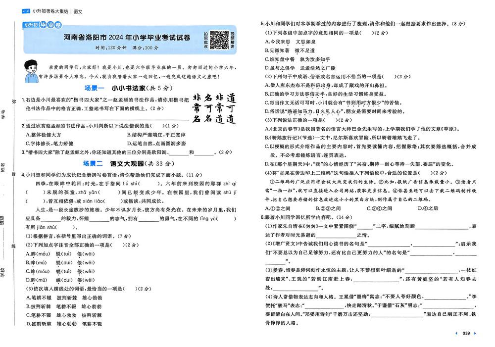 河南省洛阳市 2024 年小学毕业考试语文试卷video
