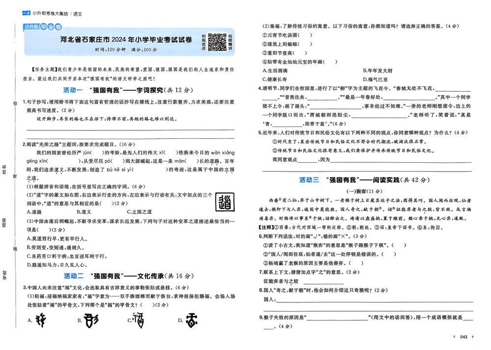 河北省石家庄市 2024 年小学毕业考试语文试卷video