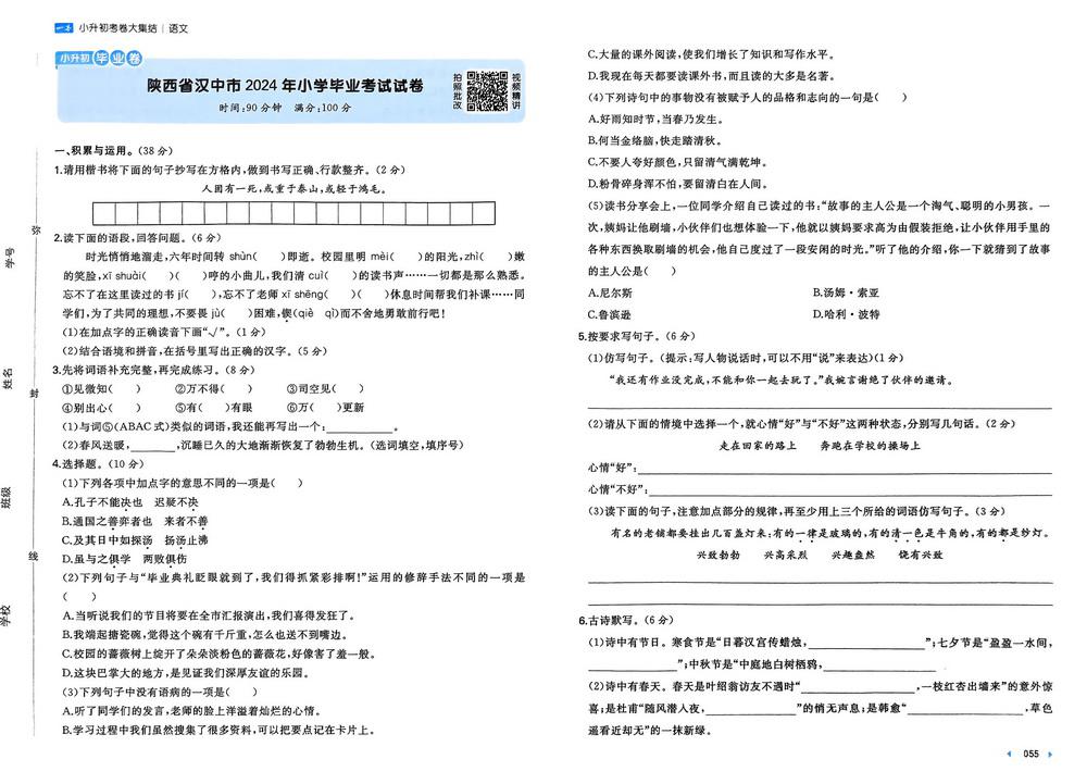 陕西省汉中市 2024 年小学毕业考试语文试卷video