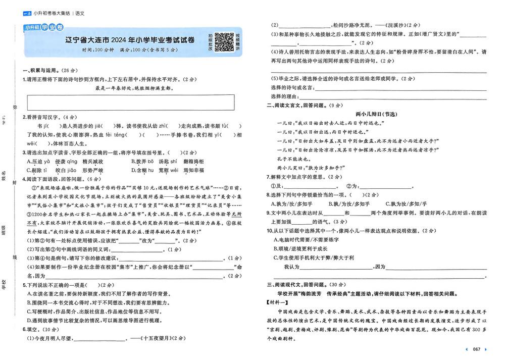 辽宁省大连市 2024 年小学毕业考试语文试卷video