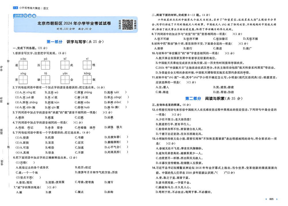 北京市朝阳区 2024年小学毕业考试语文试卷video