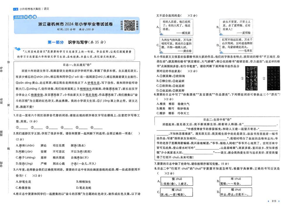 浙江省杭州市 2024 年小学毕业考试语文试卷video