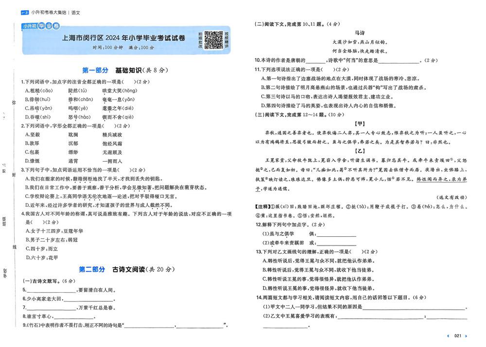 上海市闵行区 2024 年小学毕业考试语文试卷video