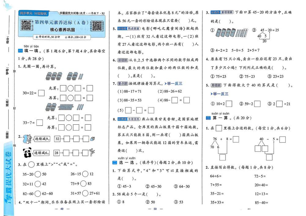 新教材人教版一年级下册数学第四单元测试卷十三