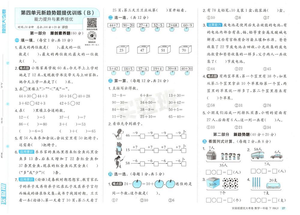 新教材人教版一年级下册数学第四单元测试卷十六