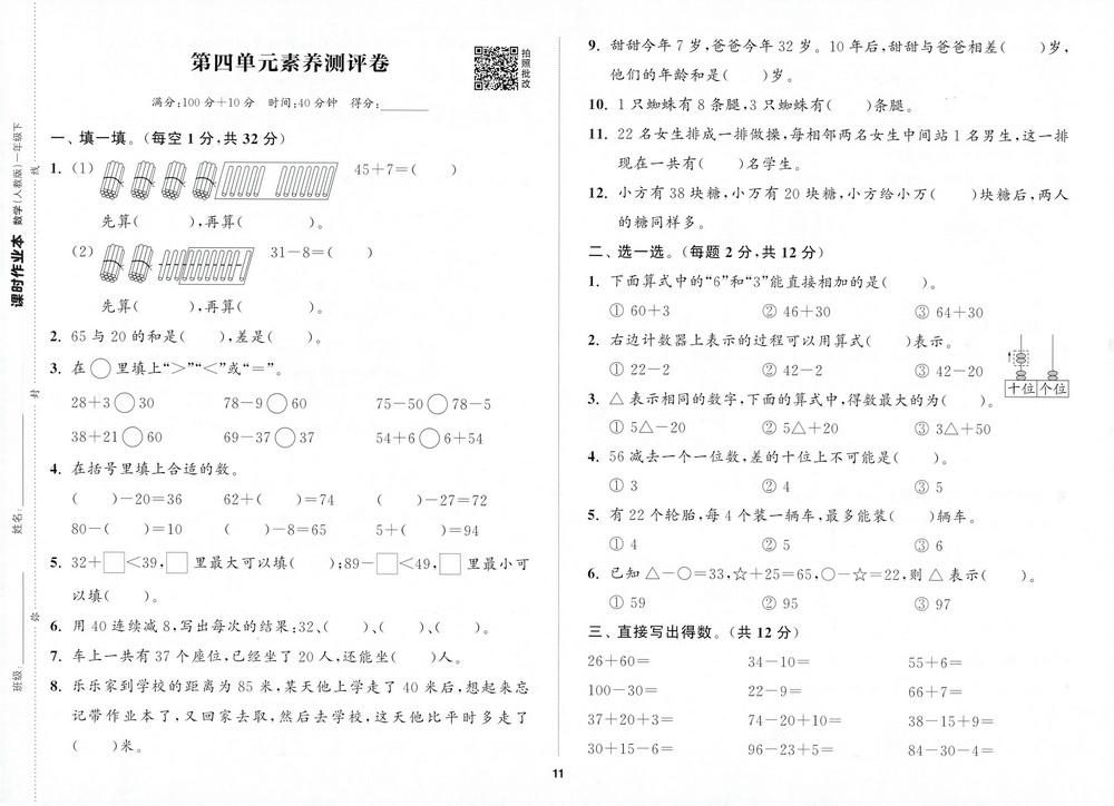 新教材人教版一年级下册数学第四单元测试卷二十六