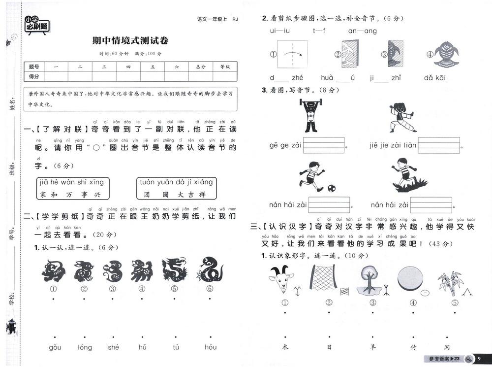 新教材人教版一年级上册语文期中测试卷十八