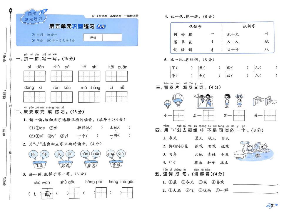 新教材人教版一年级上册语文第五单元测试卷五