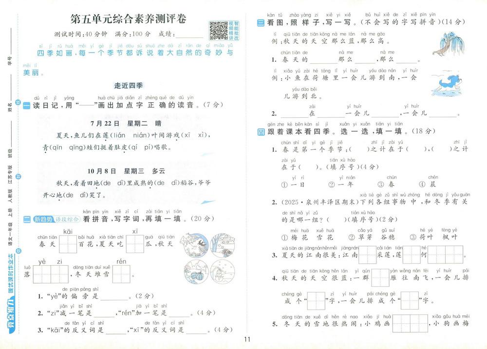 新教材人教版一年级上册语文第五单元测试卷二十