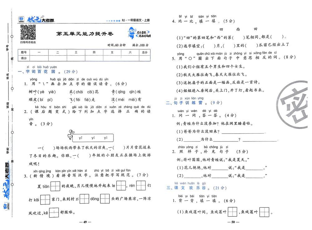 新教材人教版一年级上册语文第五单元测试卷二十一