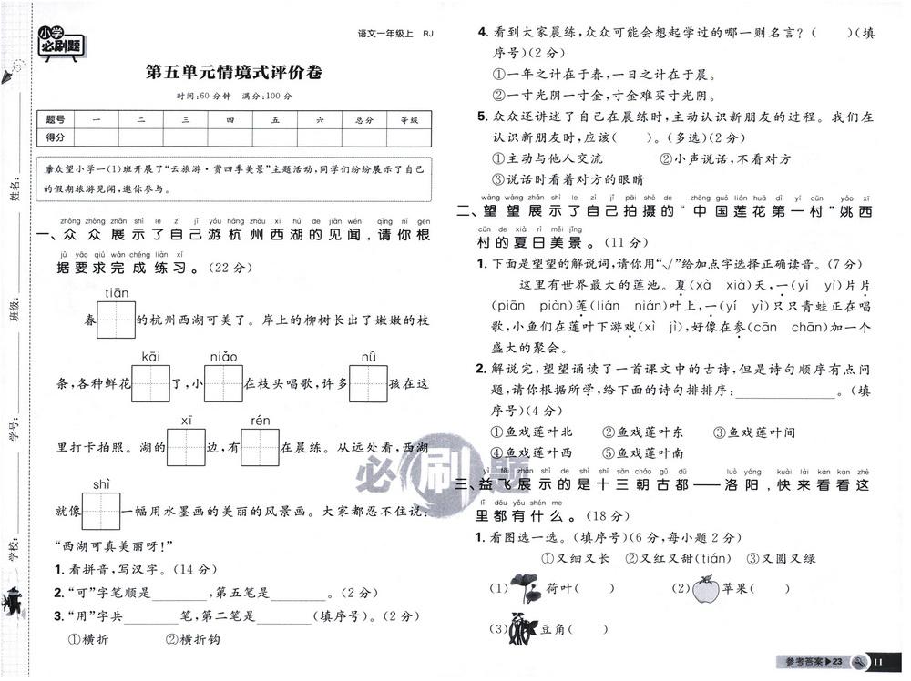 新教材人教版一年级上册语文第五单元测试卷二十二