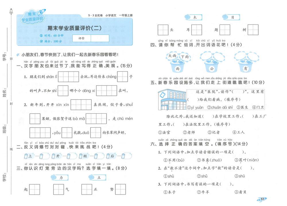 新教材人教版一年级上册语文期末测试卷四十三